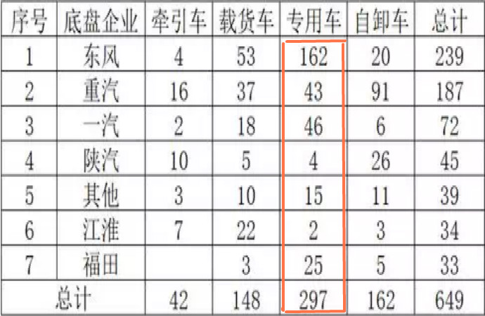 橫向比較幾款整車(chē)可以發(fā)現(xiàn),牽引、載貨、自卸大多為主機(jī)廠(chǎng)自己申報(bào),而國(guó)六專(zhuān)用車(chē)產(chǎn)品多為改裝廠(chǎng)申報(bào),所以是“兵家必爭(zhēng)之地”。