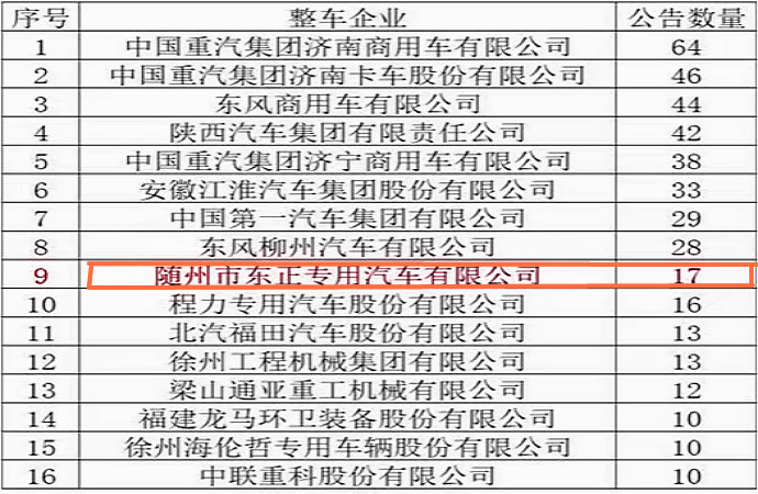 對(duì)于整車(chē)公告而言,本批國(guó)六重卡公告數(shù)量10個(gè)以上的企業(yè),共計(jì)16家,主機(jī)廠(chǎng)占據(jù)主流,重汽濟(jì)南商用車(chē)、重汽濟(jì)南卡車(chē)東風(fēng)商用車(chē)公司分列前三名。改裝廠(chǎng)中,隨州東正汽車(chē)排名靠前。