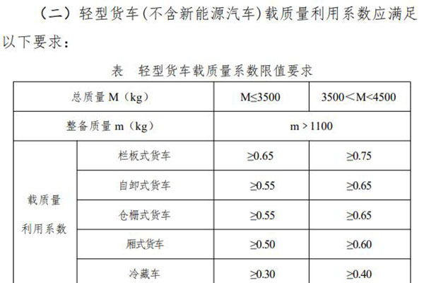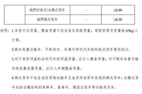 對載質(zhì)量系數(shù)的要求中包含很多專用車型,其中隨車起重運輸車、平板貨車、車廂可卸式汽車按欄板式貨車要求執(zhí)行;對于裝有頂蓋的自卸汽車的頂蓋質(zhì)量,應計入整備質(zhì)量,對于隨車起重運輸車的起重裝置質(zhì)量,應計入車輛整備質(zhì)量;廂式貨車不包含貨物運輸車及由多用途貨車改裝的廂式貨車,倉柵式貨車包括倉柵結構的養(yǎng)蜂車、畜禽車、桶裝垃圾車等運輸類汽車。
