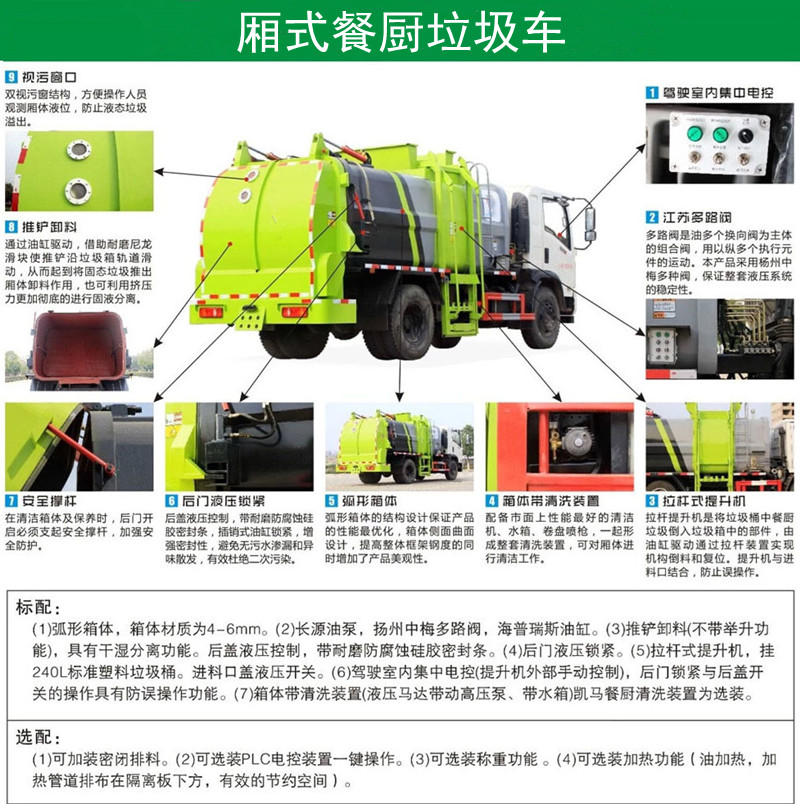 方罐式餐廚垃圾車:弧形廂體,箱體內(nèi)可實(shí)現(xiàn)固液分離,推鏟卸料,后蓋液壓開啟/鎖緊(帶耐磨橡膠密封條密封-后門關(guān)閉后滴水不漏),后門液壓鎖緊防誤操作功能,掛桶式提升機(jī),可配合120升、240升標(biāo)準(zhǔn)垃圾桶使用,清洗裝置(帶水箱、液壓馬達(dá)帶動(dòng)高壓泵)。